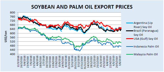 Прогнозируется, что экспорт соевого масла вырастет на 5 процентов в 2019/20 году, при этом общий объем производства достигнет 11,8 млн. тонн и будет соответствовать рекордному уровню, установленному в 2015/16 году. Увеличение экспортных запасов в результате увеличения производства в Аргентине поможет увеличить продажи в новом году, чему способствует растущий спрос и конкурентоспособные цены. Конечные остатки снизятся незначительно, но останутся существенно ниже среднего показателя за 5 лет.