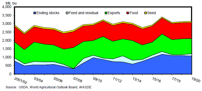 Конечные остатки на 2019/20 маркетинговый год снижены почти на 70 млн. бушелей по сравнению с июньским прогнозом на ожидании снижения переходящих остатков с 2018/19 маркетингового года и увеличения внутреннего потребления. В новом маркетинговом году кормовое и остаточное потребление пшеницы увеличено на 50 миллионов бушелей до 140 миллионов. Это увеличение основано на резком снижении производства кукурузы и соответствующем сокращении кормового и остаточного потребления кукурузы.