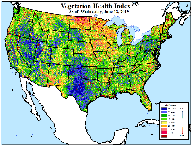 12 июня Всемирный совет по сельскохозяйственным прогнозам опубликовал карту индекса здоровья растительности (VHI) США на основе данных, предоставленных Центром спутниковых исследований NOAA / NESDIS (рис. 2). Карта VHI четко показывает лучшие значения VHI в широком поясе производства озимой пшеницы и подтверждает вывод NASS о том, что состояние большей части посевов озимой пшеницы можно оценить как «хорошее» и «отличное». Также заметно распространение засушливых условий в Северных равнинах вблизи канадской границы. Более низкий VHI в ключевом регионе производства яровой пшеницы также соответствует более медленным, чем обычно, темпам посева.