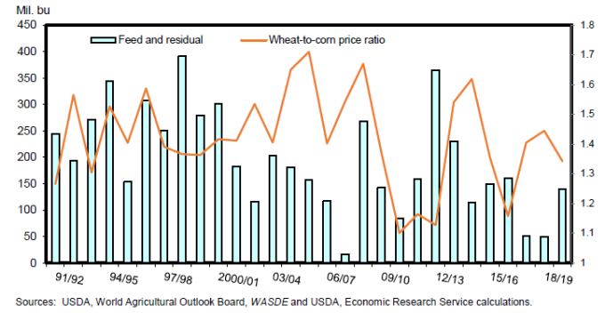 Влажные условия привели к задержкам посева кукурузы в нескольких ключевых штатах в 2019 году. За неделю, закончившуюся 9 июня, было посажено всего 83 процента от предполагаемой площади кукурузы 2019 года, что намного ниже среднего показателя за 5 лет, равного 99 процентам. Прогнозируется, что производство кукурузы в 2019/20 году сократится на 1,4 млрд. бушелей до 13,7 млрд., что в случае реализации станет самым низким уровнем с 2015/16 года. В связи с сокращением запасов кукурузы, ее кормовое потребление снижено на 300 миллионов бушелей по сравнению с прошлым месяцем, что способствует расширению маркетинговых возможностей для кормовой пшеницы в стратегических локациях. На основании значительно более ограниченного баланса цена на кукурузу повышена на 50 центов в этом месяце до 3,80 долларов за бушель. При поддержке цены на кукурузу средняя сезонная фермерская цена на пшеницу (SAFP) повышена на 40 центов до 5,10 долларов за бушель. При увеличении SAFP для обеих культур, относительное и абсолютное повышение для кукурузы больше, чем для пшеницы, соотношение цены пшеницы к кукурузе улучшилось по сравнению с прошлым месяцем и отражает более благоприятные условия для кормового потребления пшеницы (рис. 4).
