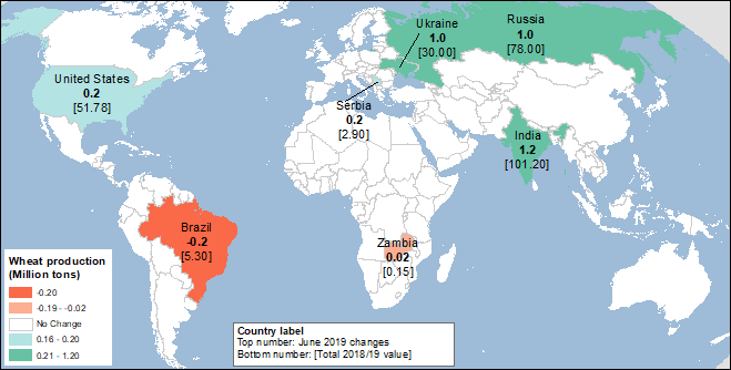 Прогнозируется, что мировое производство пшеницы в 2019/20 году достигнет нового рекорда в 780,8 млн. тонн, что на 3,3 млн. тонн больше, чем ожидалось в прошлом месяце. Этот показатель на 49,1 млн. тонн выше, чем в прошлом году, и на 18,9 млн. тонн превышает рекорд 2017/18 года. Большая часть прироста, как месячного, так и годового, приходится на производство пшеницы в мире за вычетом США. Два основных экспортера пшеницы — Россия и Украина — а также Индия ожидают увеличения производства.