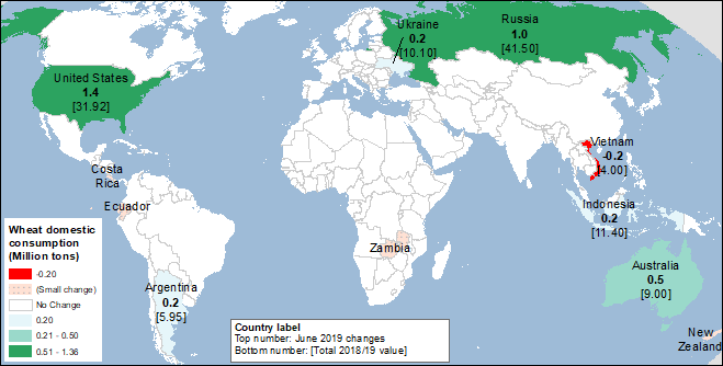 Прогноз мирового потребления пшеницы в 2019/20 году повышен в этом месяце на 3,6 млн. тонн, а потребление за вычетом США — на 2,2 млн. тонн. В дополнение к повышению прогноза кормового потребления в США, наибольший рост потребления пшеницы приходится на Россию, где обе категории внутреннего потребления пшеницы — кормовое и остаточное, а также пищевое, семенное и промышленное (FSI) — в общей сложности повышены на 1,0 млн. тонн, вследствие повышения перспектив производства. Прогноз кормового и остаточного потребления для Австралии также увеличен на 0,5 млн. тонн. Это связано с предположением об умеренном восстановлении поголовья скота после засухи 2018/19 г., что потребует дополнительного кормового зерна, поскольку пастбищ все еще недостаточно. Кормовое потребление также повышено для Украины (более высокий прогнозируемый объем производства) и Индонезии. В Индонезии доля пшеницы в корме продолжает увеличиваться. В то время как правительство Индонезии преследует цель самообеспеченности кукурузой и тем самым ограничивает импорт, страна все в большей степени удовлетворяет растущий внутренний кормовой спрос с помощью низкокачественной пшеницы из Украины и России. Небольшие корректировки потребления пшеницы также внесены для ряда других стран.