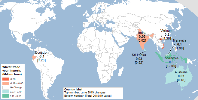 Прогнозируемая рекордная мировая торговля пшеницей для международного торгового сезона 2019/20 (июль – июнь) немного повышена — на 0,3 млн. тонн в этом месяце до 183,9 млн. тонн. Перспективы импорта скорректированы в сторону увеличения на 0,5 млн. тонн для Индонезии, где ожидается дальнейшее увеличение импорта на основе текущих темпов и политики правительства (см. выше), а также в Малайзии. Наглядно информация об изменениях импорта пшеницы в этом месяце на 2019/20 г. представлена на карте 3.