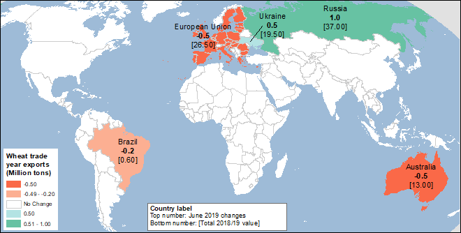 Дополнительные изменения экспорта пшеницы для международного торгового года 2018/19, который заканчивается в июне 2019 года, связаны со значительными сдвигами, при том что общий объем торговли сокращен на 1,5 миллиона тонн. Поскольку приближается конец международного торгового года, длящегося с июля по июнь, изменения в основном основаны на темпах торговли. Российский экспорт сокращен на 1,0 млн тонн до 36,0 млн. Прогноз экспорта также сокращен на 0,3 млн. тонн для Украины, которая, как сообщается, сталкивается с проблемами железнодорожных перевозок. Другие сокращения включают Аргентину (на 0,5 млн. тонн до 12,5), Австралию (на 0,2 млн. тонн до 9,8 млн., самый низкий показатель с засушливого 2007/08 года) и Бразилию (на 0,2 млн. тонн).