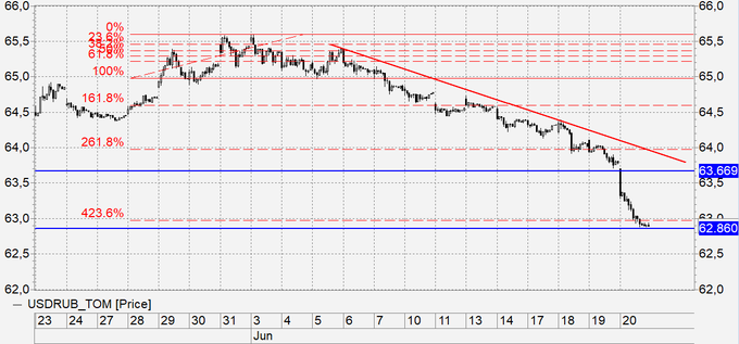 Рубль: разорвали 63.60 с открытием сессии вчера и упали на 62.86, тем самым несколько перевыполнив цель на 423.6%. Мы пробили важную поддержку в районе 63.60, теперь нам надо вернуться к данному уровню и проверить его на прочность с обратной стороны. Если же сегодня пойдем еще ниже, например на 62.00 – это ралли. Тогда внизу будет только 61.30 (59.50).
