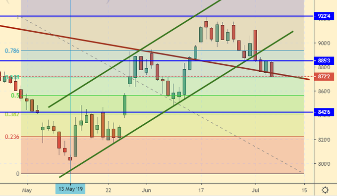 Сценарий роста: рассматриваем июльский фьючерс, дата экспирации 12 июля. Пятницу закончили, можно сказать, за краем. Падение ниже 870.0 вызовет сброс. Никаких улучшений между Китаем и США нет, поэтому соя остается под давлением.