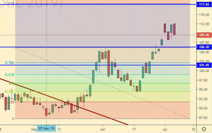 Сценарий роста: рассматриваем июльский фьючерс, дата экспирации 19 июля. Праздники не стали поводом для падения. Рынок держится у локальных максимумов, что воспринимается позитивно. Только падение ниже 106.0 испортит быкам настроение. При подходе к 117.0 можно закрыть не всё, а только 50% позиции. Чтобы затем вновь откупить их на 106.60.