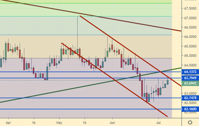 Сценарий роста: посмотрим на нефть на следующей неделе. Если там роста не будет, то отправимся к 65.00. Так как Набиуллина вбросила на рынок ожидания снижения ставки 26-го июля, бычки могут прямо с понедельника начать хулиганить. Подняться будет непросто, вплоть до 64.20 продавцов будет море.