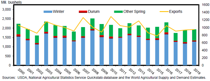 В отчете Министерства сельского хозяйства США по производству сельскохозяйственных культур от 11 июля был представлен первый основанный на опросе прогноз для яровой пшеницы и дурума на 2019 год, а также обновлены прогнозы производства озимой пшеницы на 2019 год. Исходя из ответов фермеров, NASS прогнозирует, что производство яровой пшеницы снизится примерно на 8 процентов по сравнению с прошлым годом, в основном за счет сокращения уборочных площадей (на 6 процентов по сравнению с 2018 годом). Прогнозируется, что урожайность яровой пшеницы составит 47,2 бушеля на акр, на 1,1 бушеля меньше, чем в прошлом году, что отражает погодные условия на Северных равнинах, включающие обильную или избыточную влажность в Южной Дакоте и южной части Северной Дакоты, а также засушливые условия на севере Северной Дакоты.