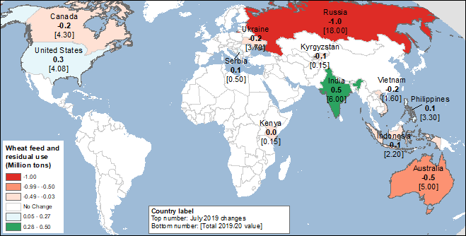 Снижение прогноза потребления за пределами США в этом месяце частично компенсирует сокращение запасов, сдерживая снижение прогнозируемых конечных запасов на 2019/20 год до 5,9 млн. тонн. Прогноз потребления пшеницы за пределами США на 2019/20 год в этом месяце снижен на 3,2 млн. тонн. Сокращение кормового потребления для России (на 1,0 млн. тонн), Австралии (на 0,5 млн. тонн), Канады и Украины (на 0,2 млн. тонн для каждой) обусловлено снижением прогнозируемых запасов. Кормовое потребление пшеницы во Вьетнаме снижено на 0,2 млн. тонн, поскольку ожидается, что страна будет импортировать меньшее количество пшеницы из-за проблемы загрязнения семенами сорняков поставок Канады. Частично компенсирует спад прогнозируемое для Индии повышение потребления пшеницы (как продовольственное, так и кормовое) при переходе от относительно более дорогой кукурузы к субсидируемой правительством пшенице. Кроме того, данные о потреблении пшеницы в Индии были пересмотрены до 2017/18 года. В этом месяце прогноз кормового и остаточного потребления пшеницы в США повышен на 0,3 млн. тонн. Изменения кормового и остаточного потребления пшеницы в этом месяце представлены на карте 2.