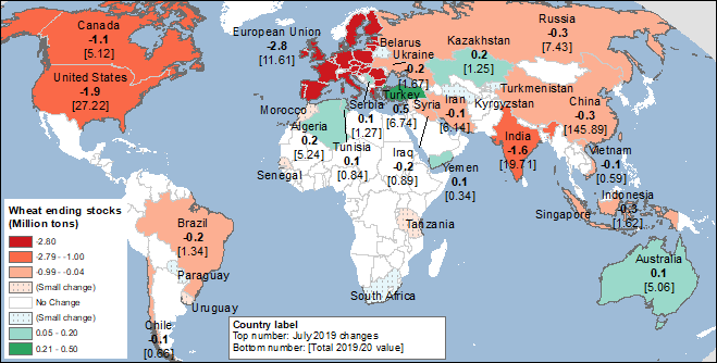 Карта 3. Изменения конечных запасов пшеницы в 2019/20 году (млн. тонн), июль 2019 г.