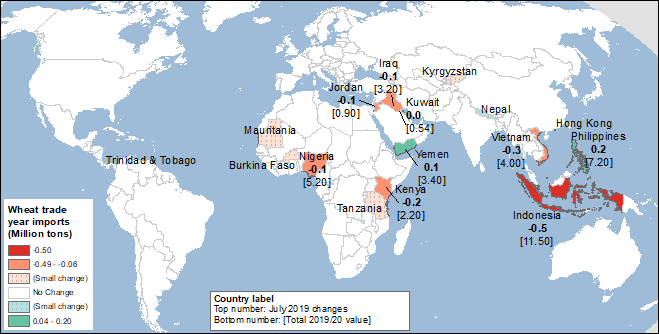Прогноз мировой торговли пшеницей в 2019/20 международном торговом году (июль-июнь) снижен на 1,7 млн. тонн в этом месяце до 182,3 млн. тонн. Снижение прогнозируемого импорта для Индонезии на 0,5 млн. тонн отражает ограничение предложения пшеницы у Австралии, России и Украины — ее основных поставщиков. Импорт пшеницы также сокращен для Вьетнама, так как он принимает меры по ограничению поступлений зараженной семенами сорняков пшеницы из России, Канады и Соединенных Штатов. Из-за снижения запасов пшеницы в России импорт в Кению также сокращен. Импорт пшеницы пересмотрен для ряда стран, см. карту 4 ниже.