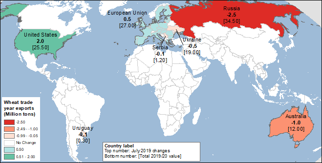 Прогноз мирового производства пшеницы в 2019/20 году снижен на 9,4 млн. тонн в этом месяце до 771,5 млн. тонн. Производство за пределами США сокращено на 9,9 млн. тонн до 719,2 млн., в то время как прогноз производства озимой пшеницы в США повышен на 0,5 млн. тонн. Большое снижение в этом месяце по-прежнему оставляет производство пшеницы за пределами США на 39,6 млн. тонн выше, чем в предыдущем году. Продолжительная жаркая и сухая погода снизила перспективы производства пшеницы по всему миру в нескольких основных странах-экспортерах, тем самым уменьшив экспортный потенциал в большинстве из них и оказав дополнительную поддержку увеличению экспорта из США. Производство пшеницы значительно сокращено для России, Европейского Союза (ЕС), Австралии, Канады и Украины. Изменения в производстве пшеницы в этом месяце наглядно представлены на карте 1.