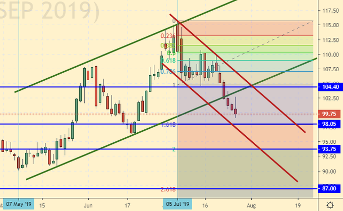 Сценарий роста: рассматриваем сентябрьский фьючерс, дата экспирации 18 сентября. Касания стопа на 99.00 не было, но это лишь вопрос времени. Если стоп выживет в понедельник, то при подъеме к 104.00 позицию на покупку следует закрыть. Мы вышли из растущего канала и теперь преимущество у медведей.