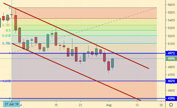 Сценарий роста: рассматриваем сентябрьский фьючерс, дата экспирации 13 сентября. Цены находятся в падающем канале. Пятничная фиксация прибыли – это краткосрочный бычий сигнал, но учитывая медвежий фундамент о покупках подумаем после возврата рынка выше 505.0.