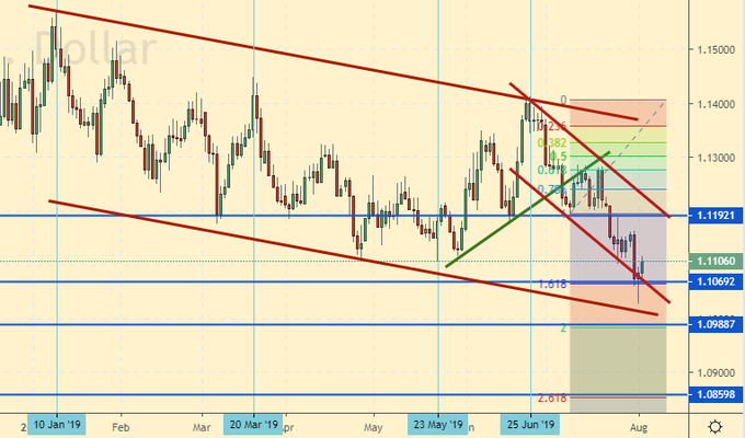 Сценарий падения: достигли первой цели на 1.1070, но это только первая часть пьесы. Рассчитываем на движение к 1.0900. Возврат к 1.1190 можно использовать для наращивания шортов по евро.