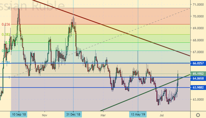 Сценарий роста: начался очередной раунд каких-то мелких пакостей в отношении России. Еще вроде август. Выходит, надоело загорать на курортах. Санкции из-за дела Скрипалей, плюс дешевеющая нефть подтолкнули котировки вверх. Да, стоит признать, что, если на рынке нефти начнется полноценное падение, рублю будет плохо. Кто вошел после роста выше 64.20 (писали о такой возможности) – получил неплохую позицию на конец недели. В понедельник должны припасть, что позволит купить подешевле. Может быть даже в районе 64.60.