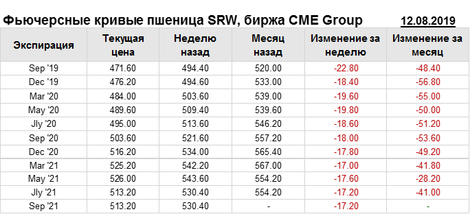 На 12.08.2019 стоимость пшеницы SRW на бирже CME Group по контракту Sep ’19 составила 471.6 цента за бушель. За прошедшую неделю стоимость пшеницы SRW упала на 22.8 цента/бушель. Как мы видим на графике, фьючерсная кривая имеет периоды, когда более дальний фьючерс дешевле ближнего. Состояние бэквардации наблюдаем на следующих контрактах: Jly ’21. Таким образом, трейдеры предполагают, что возможно превалирование предложения над спросом в указанные периоды.
