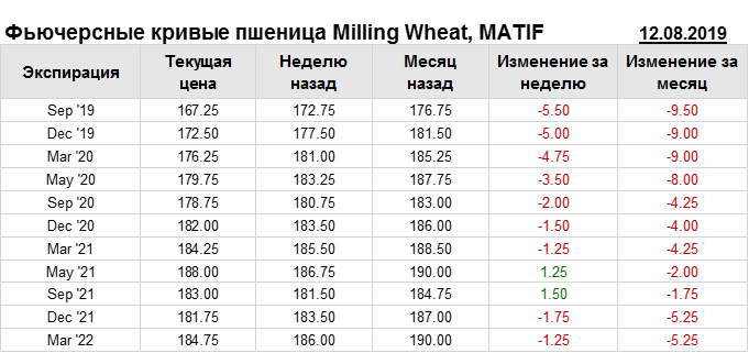 На 12.08.2019 стоимость пшеницы Milling Wheat на бирже MATIF по контракту Sep ’19 составила 167.25 евро за тонну. За прошедшую неделю стоимость пшеницы Milling Wheat упала на 5.5 евро/тонна. Как мы видим на графике, фьючерсная кривая имеет периоды, когда более дальний фьючерс дешевле ближнего. Состояние бэквардации наблюдаем на следующих контрактах: Sep ’20, Sep ’21, Dec ’21. Таким образом, трейдеры предполагают, что возможно превалирование предложения над спросом в указанные периоды.