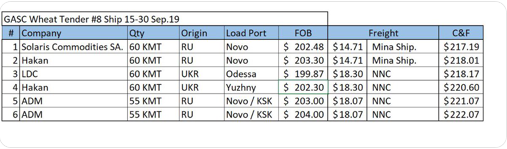 На предыдущем тендере, который состоялся 6 августа, GASC закупило 240 тыс. т российской пшеницы.