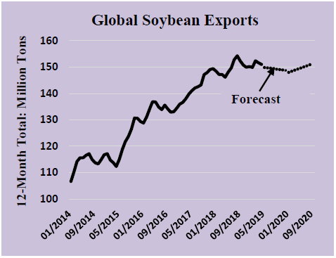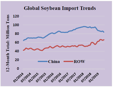 За 10 лет, предшествовавших 2018/19 году, объем мирового экспорта сои почти удвоился, при этом ежегодный прирост составлял в среднем 7,5 млн. тонн. Большая часть этого роста обеспечивалась Китаем, где рост импорта достигал в среднем 5,6 млн. тонн в год, что составляло почти 80 процентов роста торговли соей. С появлением африканской чумы свиней в Китае в середине 2018 года и продолжающимся торговым спором наблюдается устойчивое снижение объемов импорта сои в Китай, и в настоящее время прогнозируется, что импорт в 2018/19 году составит 83 миллиона тонн, что на 11 миллионов тонн меньше, чем в 2017/18 году. Если бы не увеличение спроса со стороны других рынков, отчасти вызванное снижением цен, нынешняя тенденция в мировой торговле соей стала бы отрицательной.
