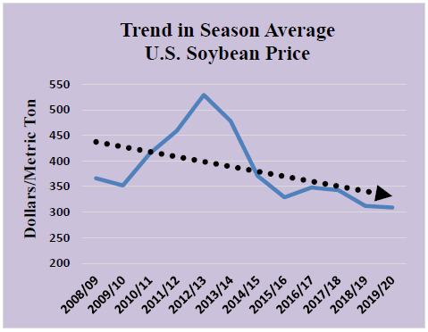 Это замедление спроса в сочетании с большим урожаем и накоплением запасов привело к тому, что цены на сою упали на 10 процентов ниже, чем несколько лет назад. Учитывая потенциал медленного роста спроса в Китае, растущего производства сои в Бразилии и обильных запасов, главным образом в Соединенных Штатах, перспективы цен на сою, вновь приближающихся к 10 долл. США за бушель (370 долл. США за тонну), значительно снизились.