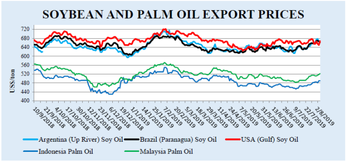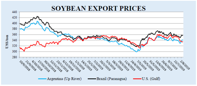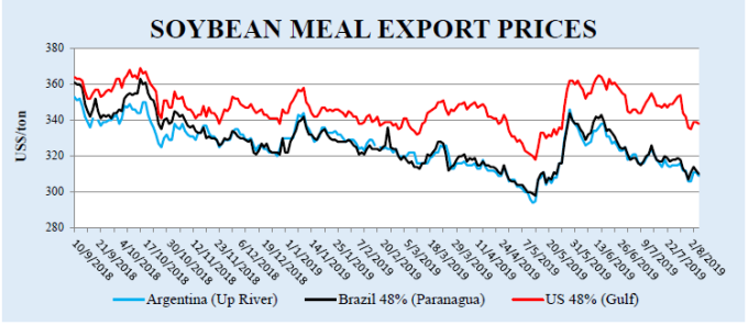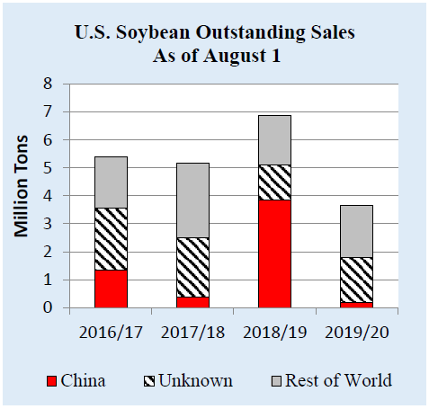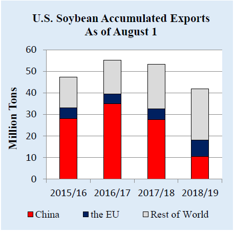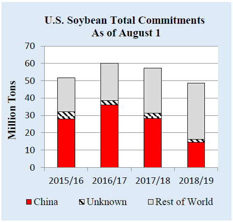 За неделю, закончившуюся 1 августа 2019 г., обязательства США по экспорту сои в 2018/19 г. (отсроченные продажи плюс накопленный экспорт) в Китай составили 14,5 млн тонн по сравнению с 27,9 млн год назад. Общий объем обязательств перед миром составил 48,8 млн. тонн против 58,5 млн. за аналогичный период прошлого года. Накопленный экспорт сои составил 42,0 млн тонн, что на 11,3 млн тонн меньше, чем в прошлом году. Накопленный экспорт сои в Китай составил 10,6 млн. тонн, что на 16,9 млн. тонн меньше, чем в прошлом году. Поставки в остальные страны мира составили 31,3 млн тонн, что на 5,6 млн тонн больше, чем в прошлом году за тот же период.
