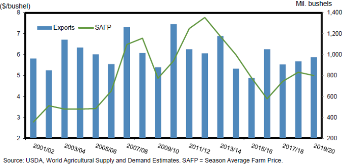 Рисунок 3. Прогноз экспорта пшеницы повышен на 2019/20 г., ожидается, что переходящие запасы останутся выше уровня в 1 млрд. бушелей.