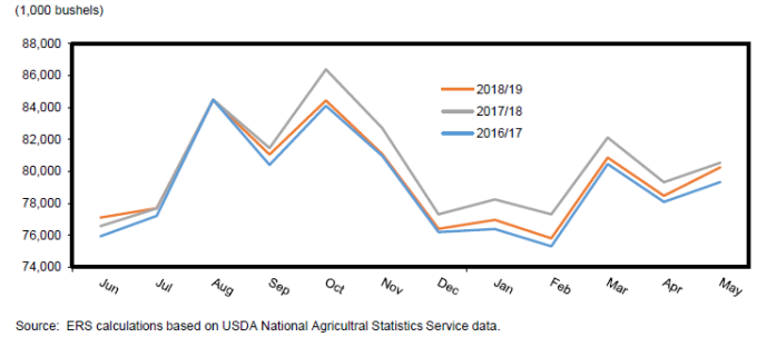 После высоких показателей в первые месяцы 2018/19 маркетингового года, ежемесячные оценки продовольственного потребления регулярно опускались ниже показателей потребления предыдущего года. Исходя из данных ежемесячного продовольственного потребления, годовое продовольственное потребление было сокращено на 5 миллионов бушелей в марте и мае перед финальным сокращением на 5,42 миллиона бушелей в августе. Оценка продовольственного потребления на 2018/19 г. составляет 954,6 млн. бушелей, что на 10 млн. бушелей ниже оценки 2017/18 года.