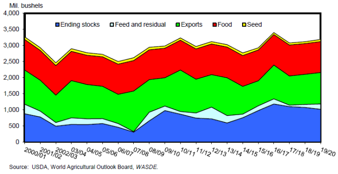 o На основе данных о производстве муки NASS и данных о торговле, приведенных Бюро статистики США, продовольственное потребление за 2018/19 маркетинговый год оценивается в 954 млн. бушелей.