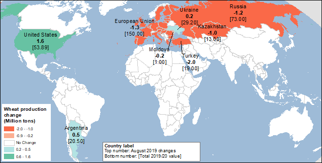 Мировое производство пшеницы в 2019/20 году еще больше сокращено в этом месяце, на 3,4 млн до 768,1 млн. тонн. Производство за пределами США сокращено на 5,0 млн. тонн до 714,2 млн., в то время как прогноз по производству озимой пшеницы в США повышен на 1,6 млн. тонн. Сокращение прогноза все еще оставляет производство пшеницы за пределами США на 34,9 млн. тонн выше, чем в предыдущем году. Сокращение перспектив производства пшеницы для нескольких основных стран-экспортеров ограничивает их экспортный потенциал и обеспечивает дополнительную поддержку для роста экспорта США. Производство пшеницы пересмотрено в сторону понижения для Европейского Союза (ЕС), России, Казахстана и Турции. Увеличение прогнозируемого производства пшеницы в Аргентине и небольшой рост в Украине частично компенсируют снижение. Наглядное изображение изменений в производстве пшеницы в этом месяце представлено на карте 1.