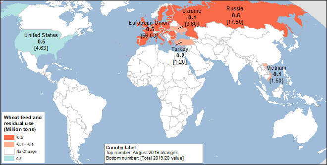 Прогноз потребления пшеницы за пределами США на 2019/20 год в этом месяце сокращен на 2,4 млн. тонн, при сокращении кормового потребления пшеницы для ЕС и России (на 0,5 млн. тонн) и для Турции (на 0,2 млн. тонн), вслед за снижением прогнозируемых перспектив производства. Несмотря на сокращение кормового потребления пшеницы в ЕС, общее кормовое потребление в регионе повышено по сравнению с предыдущим месяцем, поскольку импорт и потребление конкурентоспособной по цене кукурузы из Украины растет. В этом месяце кормовое и остаточное потребление пшеницы в США повышено на 0,6 млн. тонн. Наглядно изменения кормового и остаточного потребления пшеницы в этом месяце представлены на карте 2.