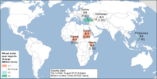 Мировая торговля пшеницей для международного торгового 2019/20 года (июль-июнь) практически не изменилась в этом месяце и составляет 182,1 млн. тонн, хотя существенные изменения внесены для основных экспортеров. Тем не менее, импорт пшеницы пересмотрен для ряда стран с существенными компенсирующими изменениями (см. карту 3 ниже).