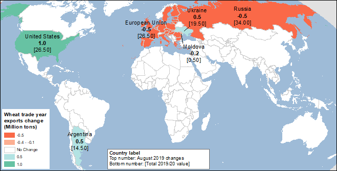 В этом месяце прогноз запасов пшеницы в США повышен, а снижение конкуренции со стороны стран Черноморского региона и ЕС, как ожидается, улучшит перспективы экспорта пшеницы из США в 2019/20 г. Темпы экспорта были устойчивыми в июле 2019 года, и объем отсроченных продаж по состоянию на 1 августа 2019 года составил 5,2 миллиона тонн, что на 25 процентов больше, чем год назад. Прогноз экспорта США для международного торгового года с июля по июнь повышен еще на 1,0 млн. тонн в этом месяце до 26,5 млн. (для местного маркетингового года с июня по май экспорт повышен на 25 млн. бушелей до 975 млн.).