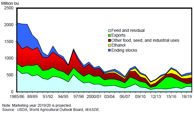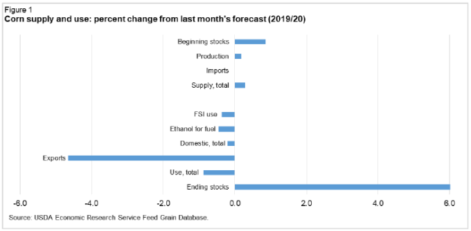 Согласно данным первого основанного на опросе прогноза урожая кукурузы на 2019/20 г., производство повышено на 26 млн. бушелей в этом месяце, поскольку увеличение урожайности на 3,5 бушеля на акр до 169,5 бушелей компенсирует сокращение уборочной площади. Уборочная площадь сокращена на 1,6 млн. акров до 82,0 млн., а посевная площадь — на 1,7 млн. акров до 90,0 млн. Если прогноз будет реализован, урожай составит 13 901 млн. бушелей, что на 519 млн. ниже уровня 2018/19 года. В результате объем запасов составляет 16 311 млн. бушелей. Прогноз начальных остатков повышен на 20 млн. бушелей до 2 360 млн., а импорт остался без изменений на уровне 50 млн. бушелей.