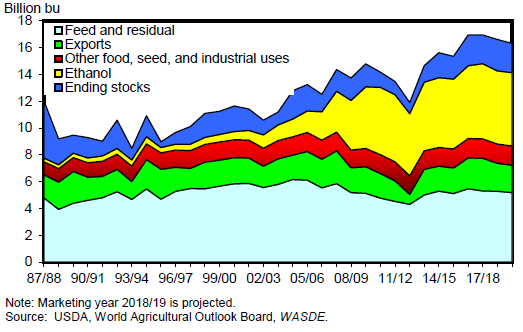 Потребление фуражного зерна в США на 2019/20 г. прогнозируется на уровне 374,7 млн. метрических тонн, что на 2,3 млн. ниже прогноза прошлого месяца и немного ниже пересмотренной оценки на 2018/19 год, равной 376,1 млн. тонн. Кормовое и остаточное потребление, прогнозируемое на уровне 137,6 млн. метрических тонн, на 0,9 млн. превышает прогноз прошлого месяца, но на 1,8 млн. ниже оценки для 2018/19 года, равной 139,3 млн. тонн. Потребление на продовольствие, семена и в промышленности (FSI) сокращено на 0,6 млн. тонн как для 2018/19, так и для 2019/20 гг. на снижении потребления кукурузы для производства этанола. Экспорт снижен на 2,5 млн. тонн на 2019/20 год. Общий объем потребления снижен на 2,3 млн. тонн на 2019/20 год до 374,7 млн., а прогноз конечных запасов повышен на 4,6 млн. до 59,3 млн.