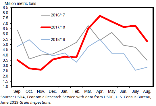 Экспорт кукурузы из США начал резко замедляться в июне. Статистические данные по экспорту кукурузы в этом месяце являются самыми низкими с 2012 года и составляют 3,1 млн. тонн. Спад продолжился в июле, так как количество инспекций составило всего 2,8 миллиона тонн. Это говорит о том, что экспорт в последнем квартале местного маркетингового года оказался ниже ожидаемого, в то время как конкуренты — производители кукурузы в Южном полушарии и вскоре в Украине — выходят на рынок с растущим экспортом.