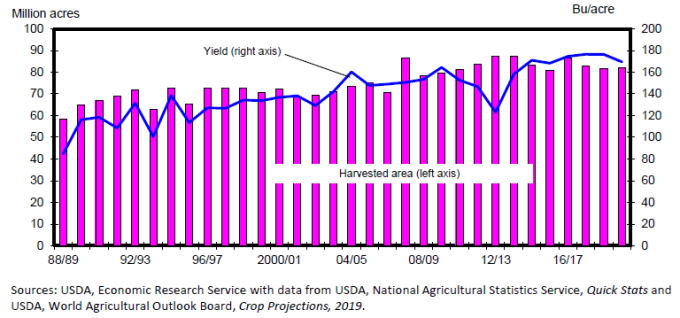 Рисунок 4. Уборочная площадь и урожайность кукурузы в США.