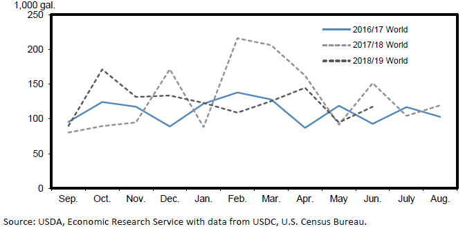 Для 2018/19 торгового года (октябрь-сентябрь) прогноз экспорта кукурузы повышен на 2,2 млн. тонн до 170,4 млн. тонн, поскольку привлекательные цены стимулируют импорт. Экспорт Бразилии в 2018/19 году увеличен на 3,5 миллиона тонн в этом месяце до нового рекорда в 37,5 миллионов. Бразильский экспорт в июле был намного выше, чем предыдущий показатель этого месяца, так как начались продажи рано убранного урожая бразильской кукурузы сезона 2018/19.
