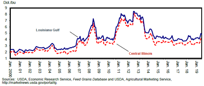 Хотя экспорт кукурузы из США для 2019/20 международного торгового года (октябрь-сентябрь) не изменился по сравнению с предыдущим месяцем и составляет 55,0 млн. тонн, экспорт кукурузы для местного маркетингового года (с сентября по август) снижен на 2,5 млн. тонн (на 100 млн. бушелей до 2 050 млн.), с учетом перспектив чрезвычайно низких поставок в первый месяц местного года — сентябрь 2019 года. Сбор урожая кукурузы и экспорт из Южного полушария (Аргентина и Бразилия) в 2018/19 году в сочетании с рекордным урожаем в Украине создают сильную конкуренцию для американского экспорта кукурузы в конце 2018/19 и в 2019/20 торговом году (сентябрь — август). В США запасы практически не изменились по сравнению с предыдущим месяцем, но снижены по сравнению с предыдущим годом и являются самыми низкими с 2015/16 года. Кроме того, производство кукурузы в 2018/19 году в Аргентине и Бразилии повышено почти на 40 миллионов тонн по сравнению с предыдущим годом, в то время как Украина, как ожидается, соберет рекордный урожай. Эти факторы в сочетании с относительно сильным долларом США, как ожидается, создадут значительные препятствия для экспорта кукурузы из США.