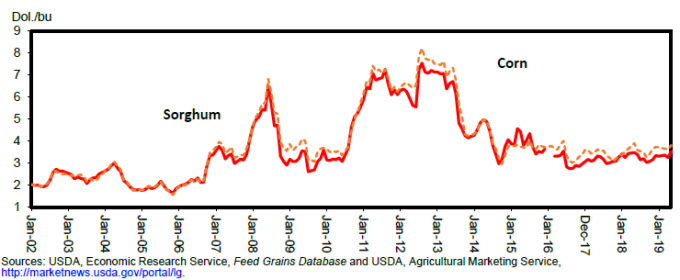 Рисунок 7. Цены по месяцам на yellow #2 сорго и кукурузу в Канзас-Сити.