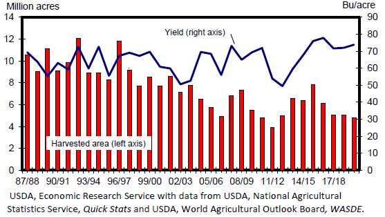 Рисунок 9. Уборочная площадь и урожайность сорго в США.