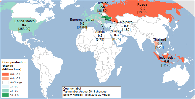 Карта 1. Изменения производства кукурузы для 2019/20 года (млн. тонн), август 2019.