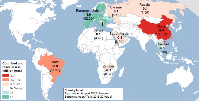Кормовое и остаточное потребление для четырех кормовых зерновых (кукуруза, сорго, ячмень, овес) и пшеницы на маркетинговый сезон 2019/20, продолжающийся с сентября по август, прогнозируется на уровне 141,0 млн. метрических тонн, что на 1,1 млн. выше прогноза прошлого месяца, главным образом за счет повышения кормового и остаточного потребления пшеницы и сорго. Для 2018/19 года кормовое и остаточное потребление повышено до 144,6 млн. тонн.