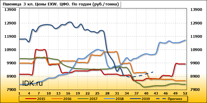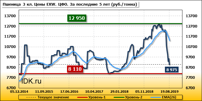 За прошедшую неделю в Центральном федеральном округе внутренние цены на пшеницу 3 класса упали на 580 руб./т. и на данный момент составляют 8975 рублей за тонну.