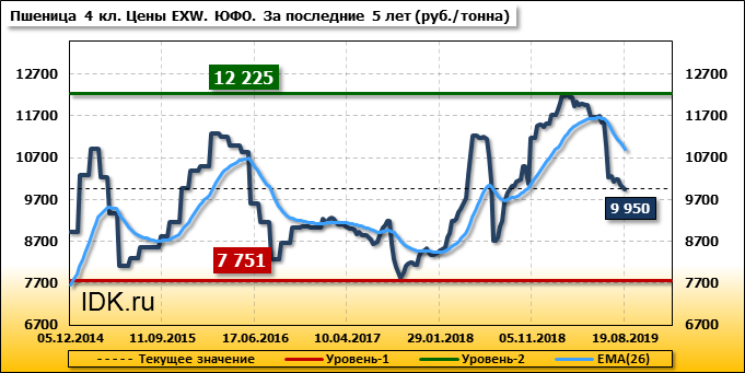 Цены на пшеницу 4-го класса снизились на 60 руб./т. и на данный момент составляют 9950 рублей за тонну.