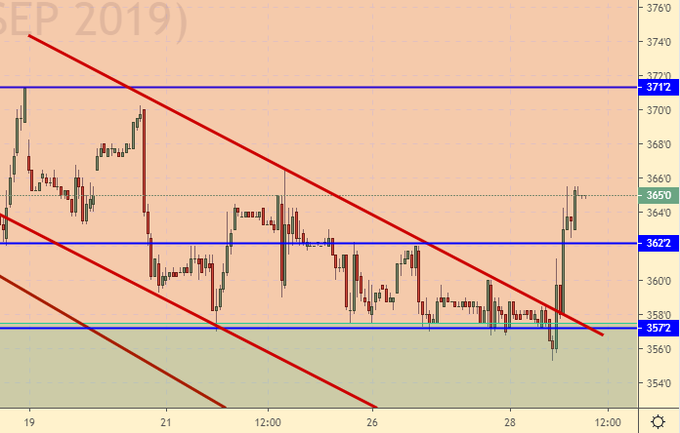 Кукуруза: «нужен один хороший шорт чтобы мы отправились вниз к 320.0», – писали мы вчера утром… Кукуруза решила не форсировать события. Стоп на 363.0 сработал. Район 360.0 может стать минимумом, который мы не сможем перекрыть вплоть до февраля 2020 года. Для того чтобы понять, что нам делать дальше, после того как ниже 358 мы не прошли, берем паузу на сегодня. Рынок должен дать нам какие-то подсказки.