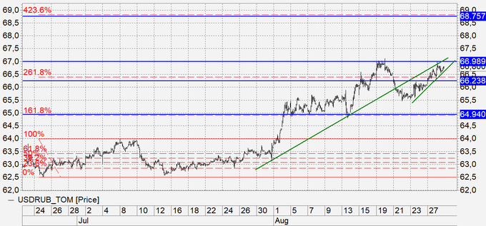 Рубль: все очень тонко. Рынок ждет новых вводных. В первую очередь со стороны рубля. Заседание ФРС только 18-го сентября, а заседание ЦБ РФ уже 6-го. На фоне замедления темпов роста экономики РФ, Банк может пригрозить дальнейшим смягчением ставки. Но делать это он будет только на фоне крепкой нефти. Судя по спросу на долговые бумаги РФ, который в среду в четыре раза превысил предложение, рубль не должен сильно волноваться о собственном будущем. Продолжаем отмечать политическую и макроэкономическую стабильность на текущий момент.