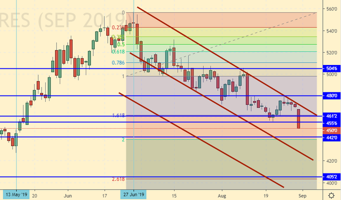 Сценарий роста: рассматриваем сентябрьский фьючерс, дата экспирации 13 сентября. Не смогли мы взять 480.0, что для быков закончится весьма негативно. Впрочем, надо просто набраться терпения и подождать пока медведи выполнят все их задачи. От 405.0 покупать обязательно.