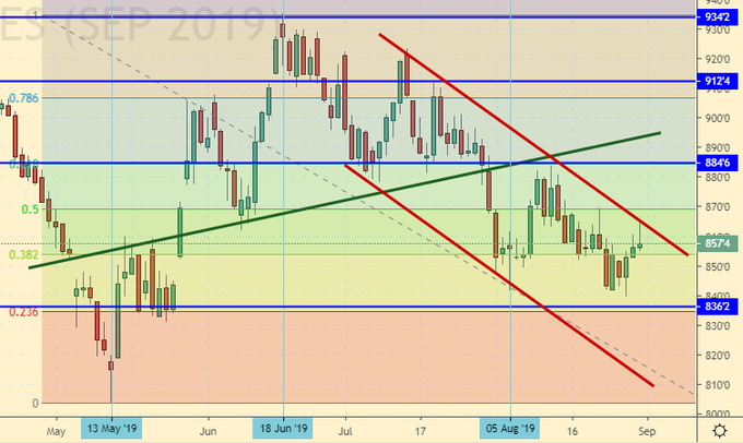 Сценарий роста: рассматриваем сентябрьский фьючерс, дата экспирации 13 сентября. Свиньи мрут из-за АЧС, Китай на поводу США не идет, рынок зерновых падает. Как тут расти? Подъем выше 870.0 будет интересен с точки зрения покупок. Пока не входим.